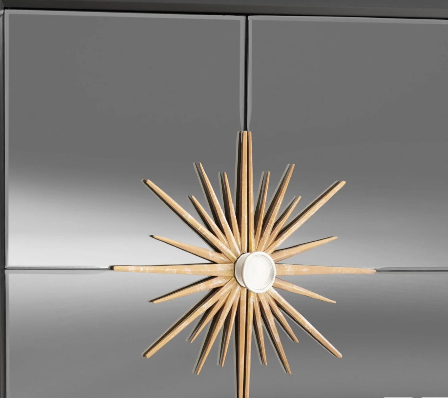 Stunning in Black!! Create dramatic high-style with the incredible Rivoli Server that features beveled black mirror panels with black wood edging, Art Deco inspired custom starburst hardware, and turned, goldleaf legs. The interior is finished in black and offers two adjustable shelves, and features no-see premium hinges. When you think about Hollywood, you think of drama...when you think about Hollywood Glam you think of Rivoli!! bmc 64x20x36H